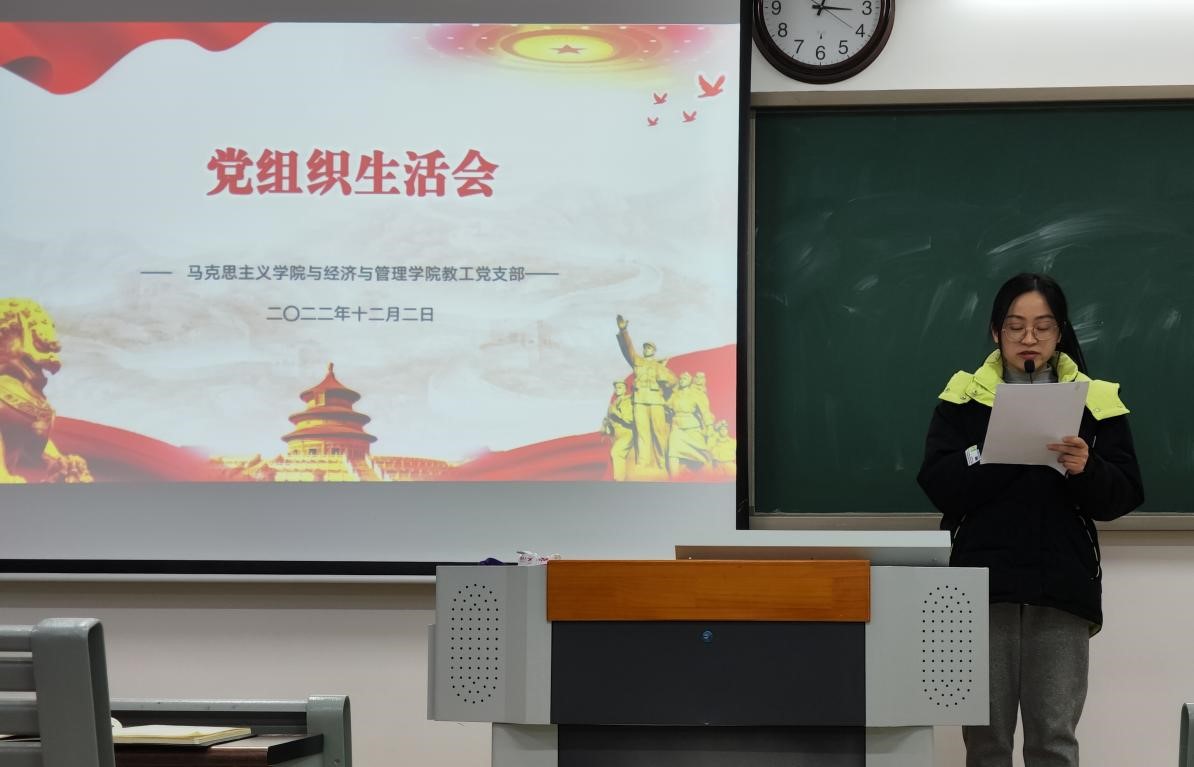 为深入学习宣传贯彻党的二十大精神及内涵,贯彻落实中国共产党章程的相关要求,2022年12月2日,在一教214教室,太阳集团tyc33455与经济管理学院教工党支部开展了组织生活会暨党的二十大重要精神专题学习活动。本次会议由经济与管理学院教工支部书记刘路路主持。
