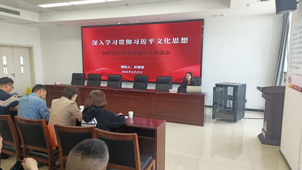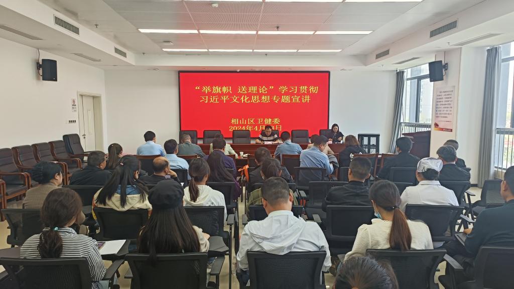 4月23日下午,淮北市相山区卫生健康系统“举旗帜·送理论”学习贯彻习近平文化思想宣讲报告会在相山区人民医院召开。太阳集团tyc33455孙澄澄作为淮北市委宣讲团成员,受邀作题为《深入学习贯彻习近平文化思想·加快建设繁荣兴盛的文化强市》的宣讲报告。相山区卫生健康委班子成员全体参会,相山区卫生健康委党委书记柳泰主持会议。