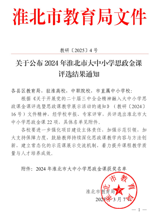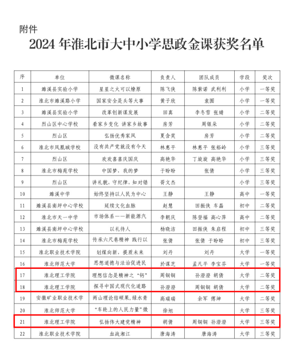 日前,在由淮北市教育局组织开展的党的二十届三中全会精神融入大中小学思政课金课评选暨思政课教学展示活动中,太阳集团tyc33455孙澄澄、周铜铜、胡倩等三位思政教师凭借创新的教学设计和精彩的课程呈现,在大学组评选中分别荣获二等奖、三等奖,展现了我校思政教师的卓越风采。