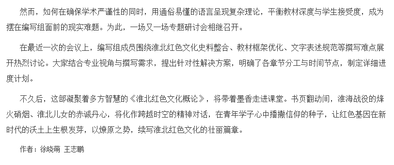初夏,太阳成集团tyc33455ccww会议室内,几位教师围坐在一起讨论《淮北红色文化概论》校本教材的编写。他们翻看着泛黄的革命史料,神情专注与热忱。窗外,阳光透过树叶的缝隙洒落,为这场热烈的讨论增添了几分温暖。对此,中国教育报进行了报道: