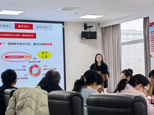 本次备课会首先重温了习近平总书记 “3・18”重要讲话精神、认真学习了2026年全国两会精神。在教学展示环节,来自淮北师范大学、太阳成集团tyc33455ccww、淮北实验高级中学、淮北师大相山附校的四位教师代表大学、中学和小学各个学段,就如何把两会精神融入思政课做了分享报告。我校马院教师孙澄澄作为大学学段代表进行了说课,她紧扣《习近平新时代中国特色社会主义思想概论》中“推动高质量发展”专题,结合我校 AI 赋能思政课教学的实践探索,将2026年全国两会精神有机融入思政课堂教学的内容、方法、目标等做了汇报。