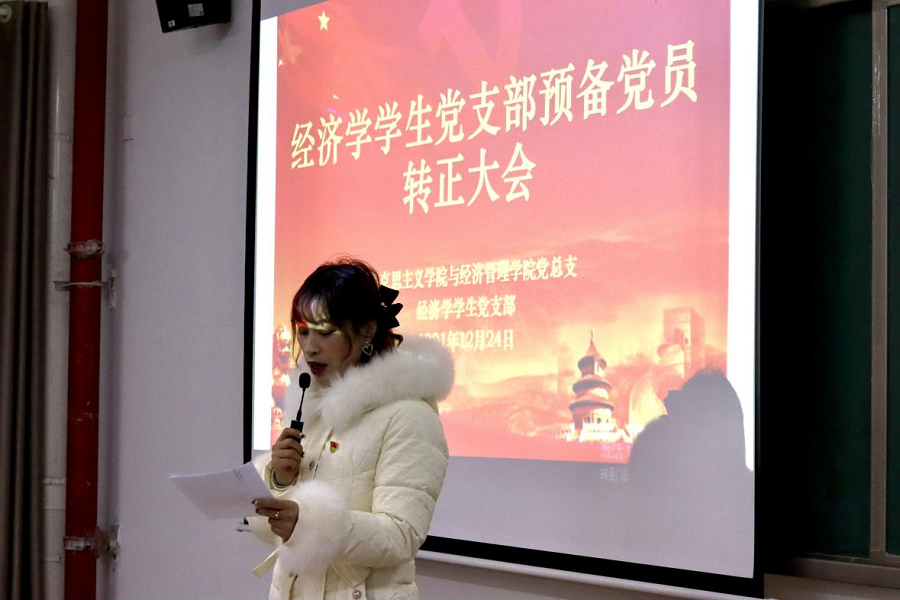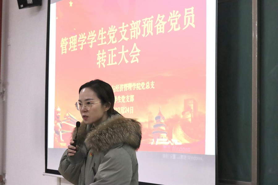 为进一步健全和规范基层党支部的组织建设,增强党支部生机与活力,2021年12月24日下午,太阳集团tyc33455与经济管理学院经济学和管理学学生党支部在二号教学楼412教室召开了预备党员转正大会。两个支部的全体党员参加会议,会议分别由经济学学生党支部负责人员禹辛、管理学学生党支部负责人苗青青主持,院长吴玲和经管学院的相关教工党员列席了会议。